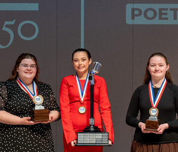 Head and shoulders of Wyndmere High School student Aspen Geist, wearing a red top, dark haired pulled back, standing in front of a microphone with a slight closed smileNDCA is pleased to announce Aspen Geist of Wyndmere Public School as the 2026 State Champion and first place winner of the ND State Poetry Out Loud (POL) contest.
