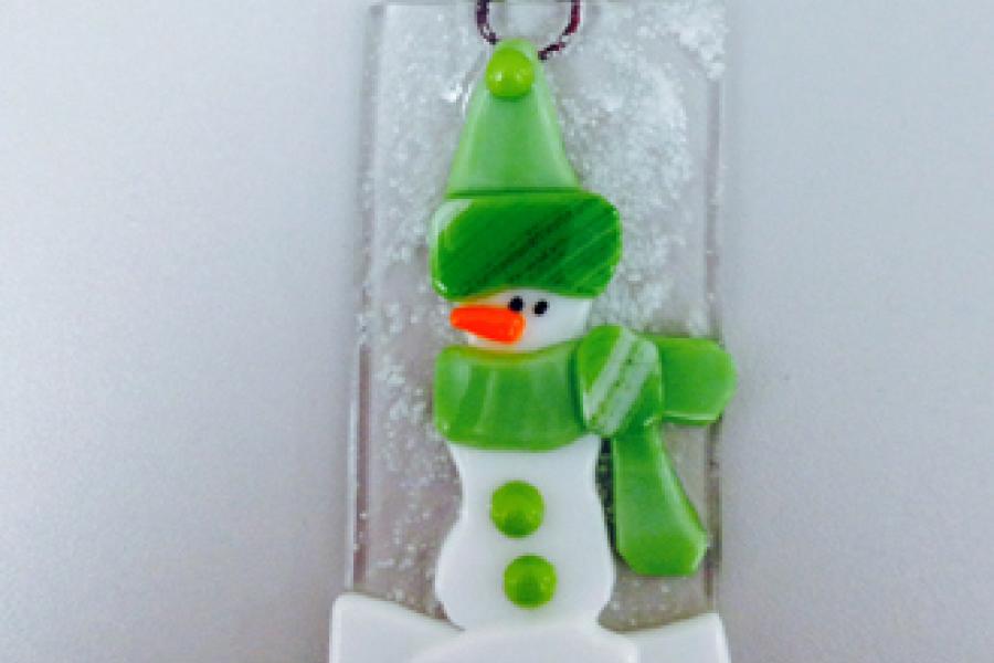 The North Dakota Council on the Arts (NDCA) announces their eighth Annual Special Edition Ornament which is now available for purchase. Kathy J. Monti, of Prairie Light Art Glass Studio in Berthold, ND, was commissioned by NDCA to create a one-of-a-kind, fused glass ornament. To create this ornament, Kathy cut and layered glass in the design of a frosty snowman. It was then fired in her kiln for about seven hours at 1400 degrees F.